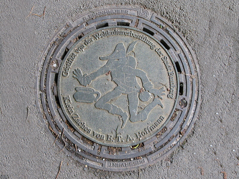 В баварском Бамберге на пешеходных дорожках можно ненадолго погрузиться в сказочные миры Эрнста Теодора Амадея Гофмана. На крышках здешних люков не только профиль известного писателя, но и знакомые многим персонажи его произведений, например, Ундина и Крошка Цахес.