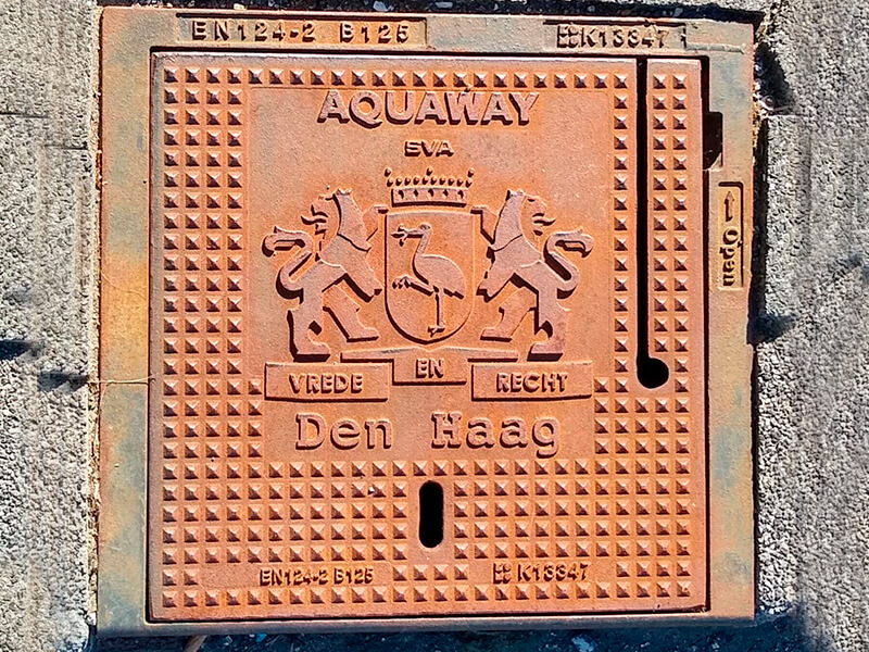 Компания Struyk Verwo Aqua в 2010 году разместила в центре города люки с круглой крышкой в квадратной рамке. Надпись в центре переводится с нидерландского как «Муниципалитет Гааги».